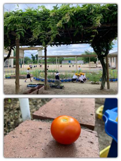 早朝から子どもたちは、ミニトマトの水やりに大忙しです。日に日に変化するミニトマトの様子を鋭く観察しています。つい先日まで緑色をしていたトマトが、赤く熟してきました。美味しそう!でも、強風でプランターが倒れた時に茎から取れてしまったミニトマトを見つけ、大事そうに持って帰ってくれたお友達もいましたよ。
