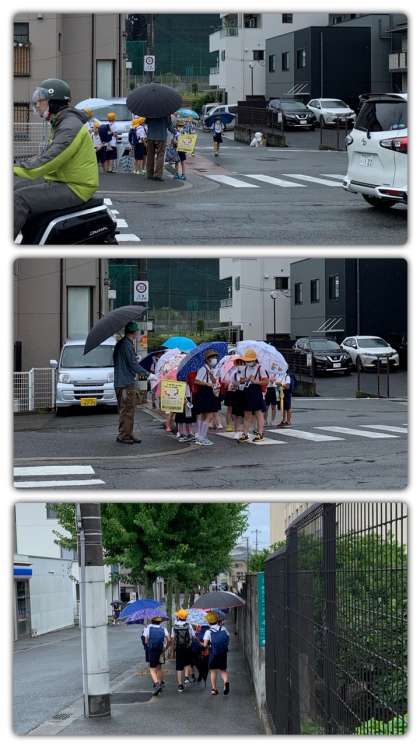 毎朝の登校時の様子です。交通量の多い地点には見守り隊の方々にご支援いただいています。「おはようございます!」のあいさつで、見守り隊の皆さんも元気になります。