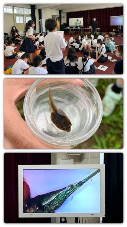 写真のオタマジャクシは外来種でウシガエルになるらしい。クマゼミにはおへそがあるらしい。などなど。