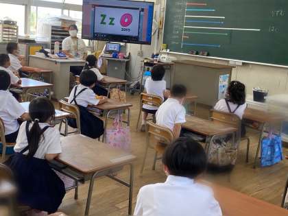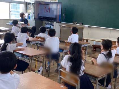 低学年は、アルファベットを見て発音したり、アルファベットのいろいろな読み方をしたり、アルファベットの書き方を学んだり、色を英語で言ったりしました。