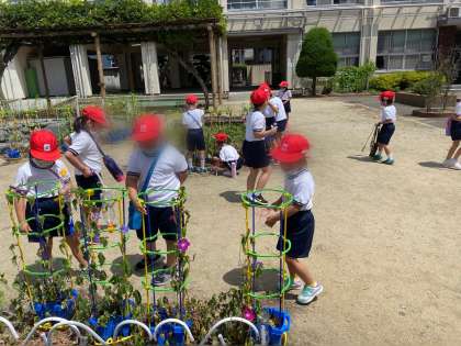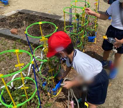 1年生は、朝顔の水やりをしに鉢のところへ行くと、水が切れて土がカラカラになっていました。