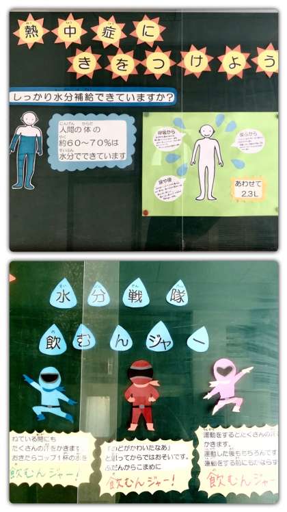 熱中症にならないように、水分補給のポイントの「こまめな水分補給」と「のどが渇く前に水分補給」を全教職員で気を付けながら、また大阪市からの暑さ指数を参考にして教育環境も考慮しながら、教育活動にあたっています。