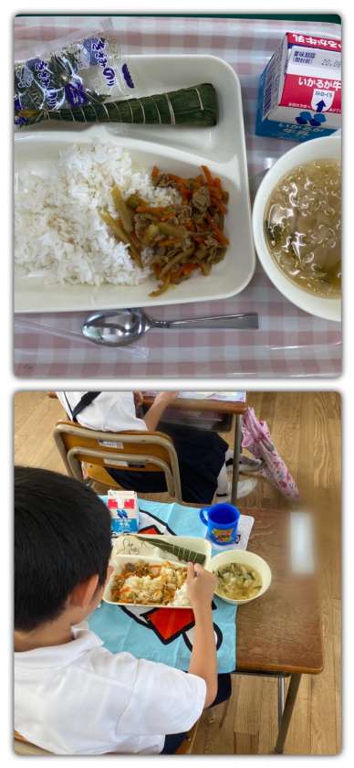 子どもたちは、自分でご飯と具材をしっかりと混ぜてちらしに仕上げてたべました。ちまきは、笹からくるくると紐をほどいて取り出して、味を楽しんでいる子どもたちがいてました。