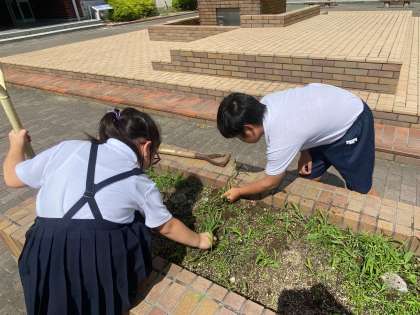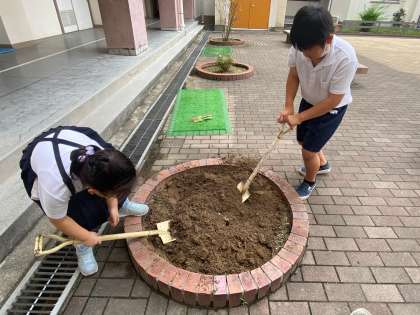 花壇で、花がなく土だけになっているところの土を耕して、種を植えました。場所によっては、雑草がたくさん生えているところがあり、雑草抜きもしました。
