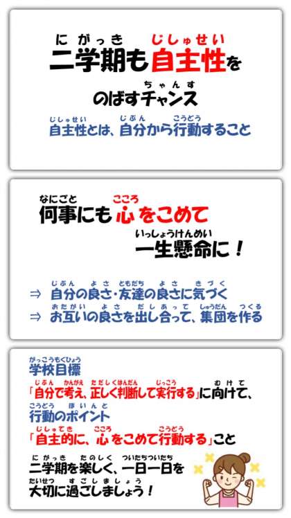 始業式の校長講話では、2学期も夏休みに引き続き、「自主性をのばすチャンス!」というお話をしました。2学期には多くの学校行事があり、それを成功させるためには一人一人のやる気を持った行動が必要です。学校目標の「自分で考え、正しく判断し、行動する」に向けて、何事にも心をこめて、頑張るぞという意思を働かせて一生懸命に取り組みましょう。心をこめてするのとしないのでは、結果が大きく異なります。心をこめて取り組むと、きっと成就感・達成感が得られ、一回り大きく成長できるでしょう。そして、自分でも知らなかった自分の良さ、友達の良さに気づき、友達との人間関係やつながりが深まり、クラス集団、学年集団の絆が体感できると思います。みんなで力を合わせて、そんな2学期にしていきましょう。