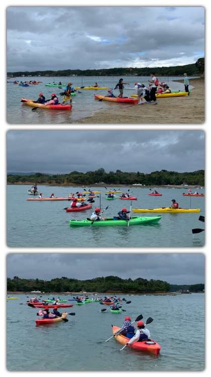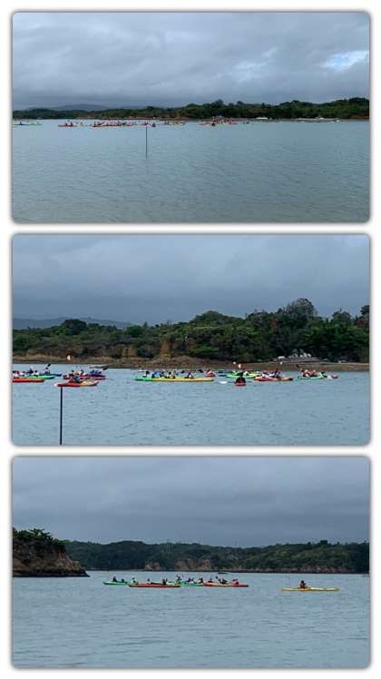 沖(島の方)まで漕いでいます。岸の方まで声が届いています。