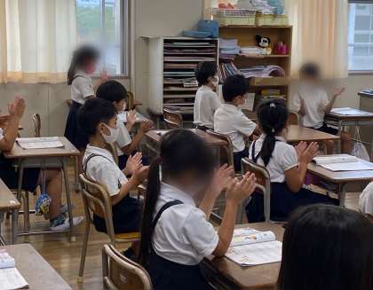 音楽で、「山のポルカ」の曲で、はくをとりながら、リズム打ちををしました。