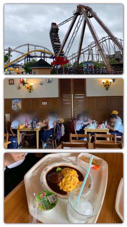 あいにくの天候のため、絶叫マシーンのピレネーは動いていないため、早目にランチをして様子を見るというグループもあります。