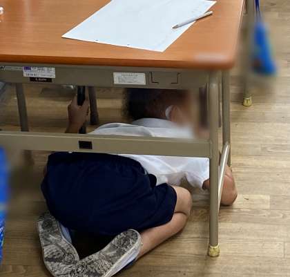 「強い揺れに備えてください」の放送を聞いて、頭を守るように机の下に机の足を持った状態で入りました。