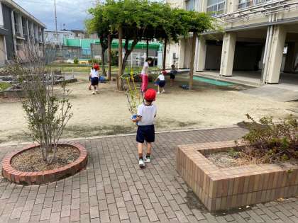 台風が近づいていたので、アサガオの鉢を校舎内に移動させていました。