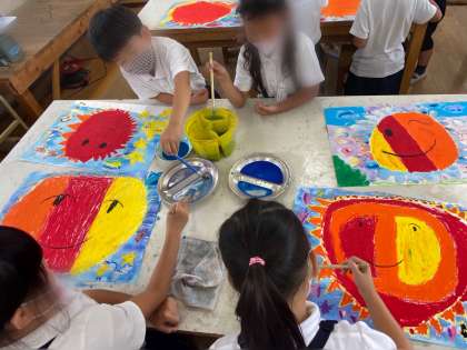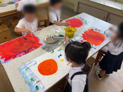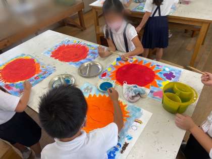 前の学習で描いた、「たいようとなかよし」の絵に、絵の具で空を描きました。