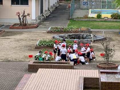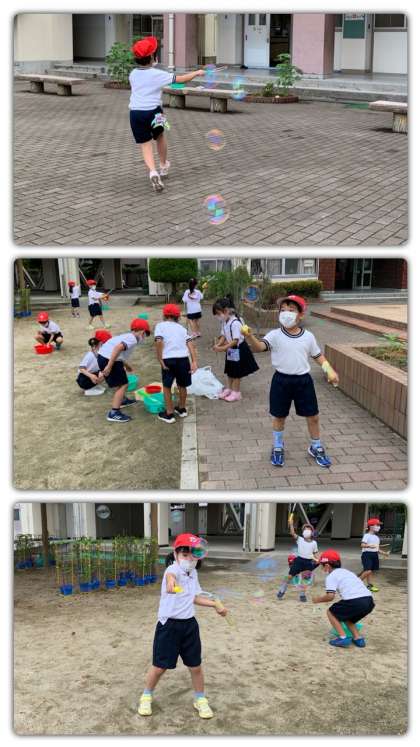 1年生は、シャボン玉の液を作って、シャボン玉を飛ばしました。どこまで飛んでいくのかな?いろんな方法で飛ばしたよ。