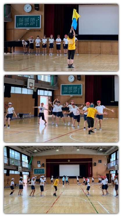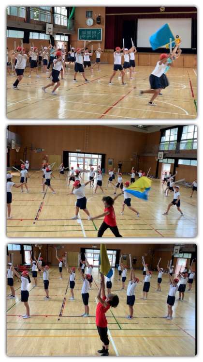 6年生にとっては、小学校生活最後の運動会に向けて、今日から団体演技の練習に入りました。ライオンキングのナンバーに乗って、ライオンや馬、鳥やハイエナなど、いろいろな動物の動きをダンスで表現します。フラッグをダイナミックに使った素晴らしいパフォーマンスとコミカルなダンスで楽しませてくれることでしょう。