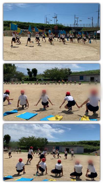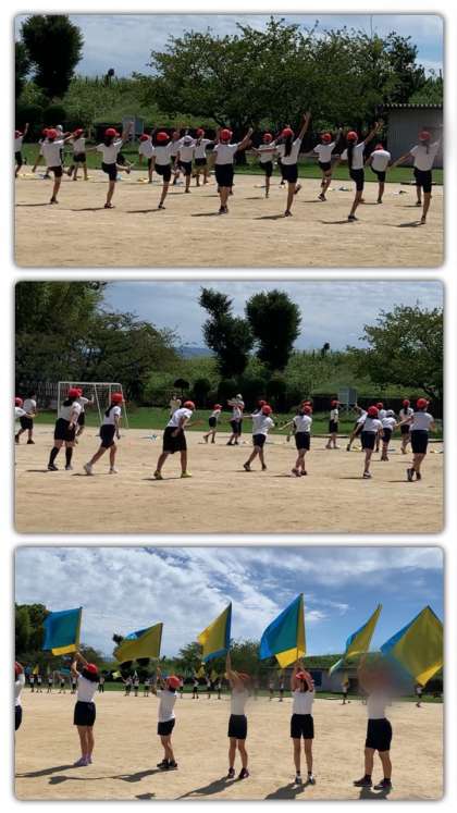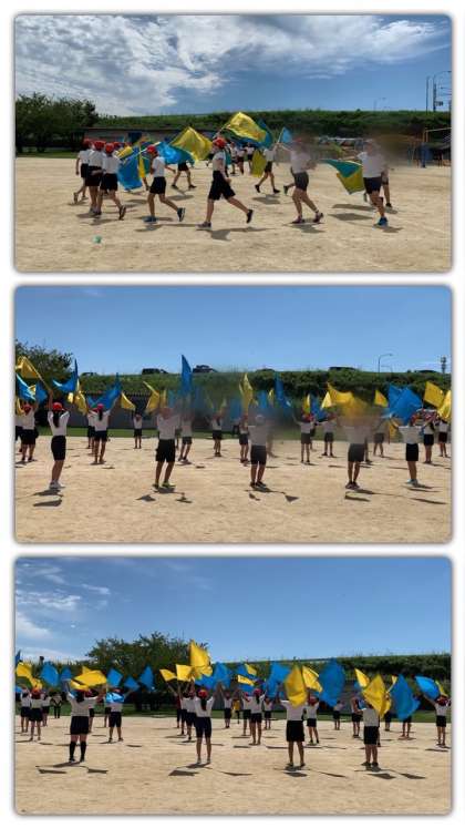 体育館で行ったあと、本番で発表する運動場で練習しました。かなり広くなったので、距離感を確かめたり、自分の位置を覚えたりしました。フラッグが青空に映え美しいですね。