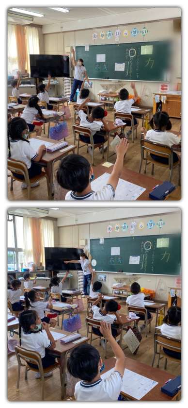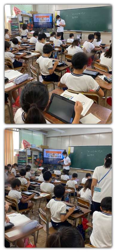 写真は、3年生がタブレット端末で文字をローマ字うちで入力している様子。