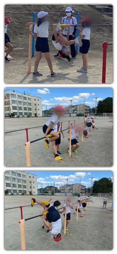 体育の学習で、鉄棒運動をしています。