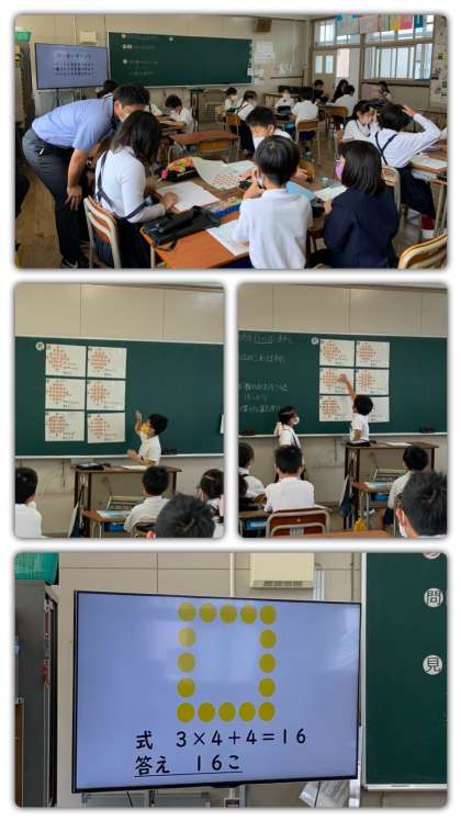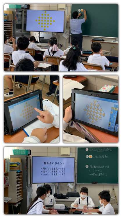 今日の算数は、「求め方を一つの式に表そう」というめあてで学習しました。ドットの数を「はかせどん」に対応させ、「はやく」「かんたんに」「せいかくに」「どんなときも」計算できる解決方法を考えていました。まず一人で考え、次はグループで交流し、全体で発表しました。自分の考え方の根拠をしっかりと説明できるように学習しています。
