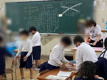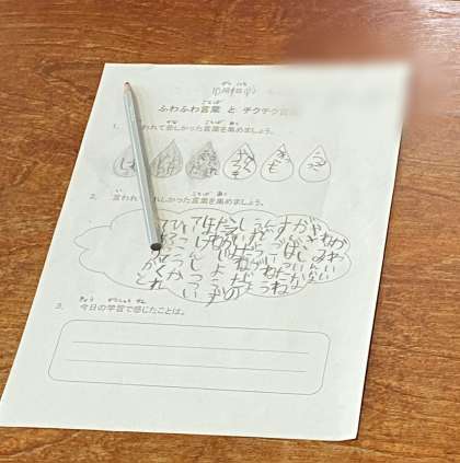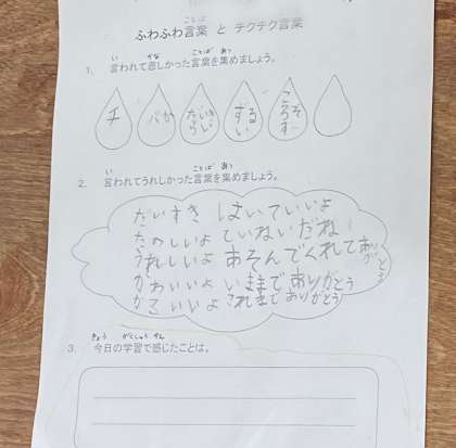 道徳の学習で、チクチク言葉とふわふわ言葉を見つけています。ふわふわ言葉をたくさん集めて、みんなに紹介しています。