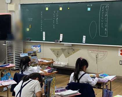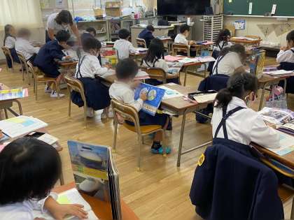 「いろいろなふね」の説明文をもとに、自分で調べたい乗り物について、図鑑などを読んだり、見たりしながらまとめて書いています。