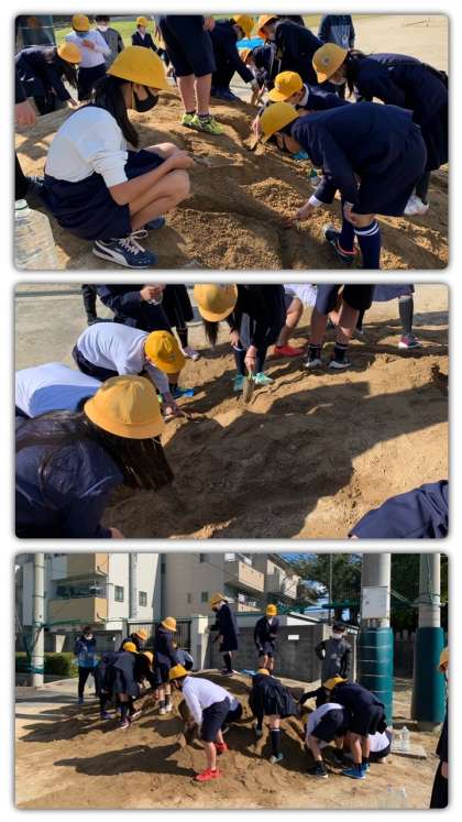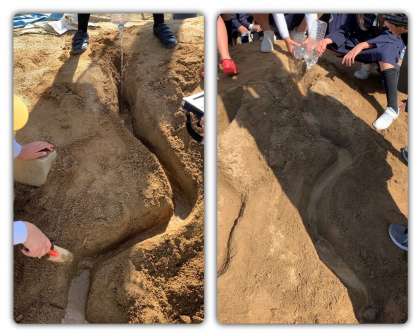 5年理科では、「水が流れると土はどのように運ばれていくのか」という実験をしました。学校の土の山を使って溝を掘って水を流してみました。