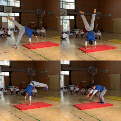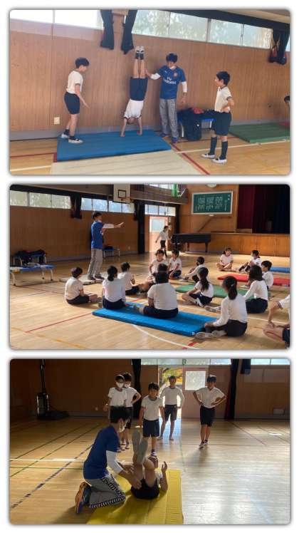 まず、器械体操は美しく見せることを意識するそうです。そのためには、足先やひざをまっすぐ伸ばしたり、お尻に力をいれたりすると形が決まるのです。また、各運動でのポイントを教えていただいたり、見本を見せていただくと、子どもたちは、ますます意欲的になり、とてもがんばっていました。