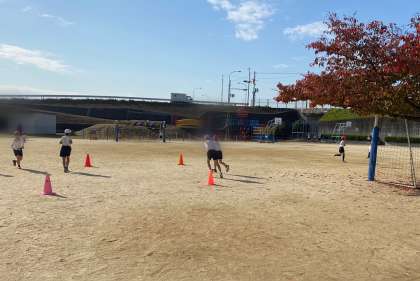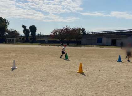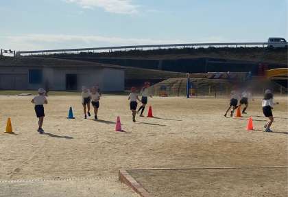 体育のはじめに、広い運動場を体を温めるためしっかりと走り込んでから、その日の学習を行っています。たくさん走るので、前半ですぐに疲れが出てきている人もいます。