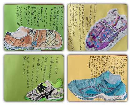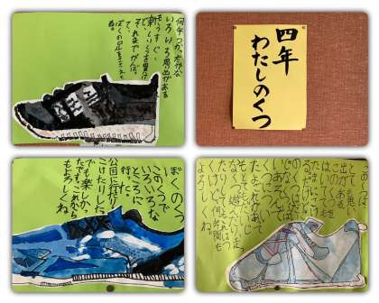 4年生の素敵な作品です。わたしのくつをデッサンし、水彩で色をつけて絵を仕上げ、そのくつに込められた思いをつづりました。たくさん2階廊下に掲示されているので、見に来てください。