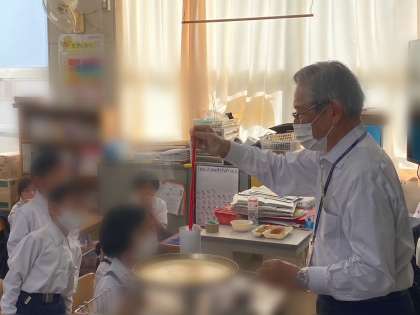 給食の時間に1年生の教室にスクールカウンセラーの東山先生が来てくださいました。