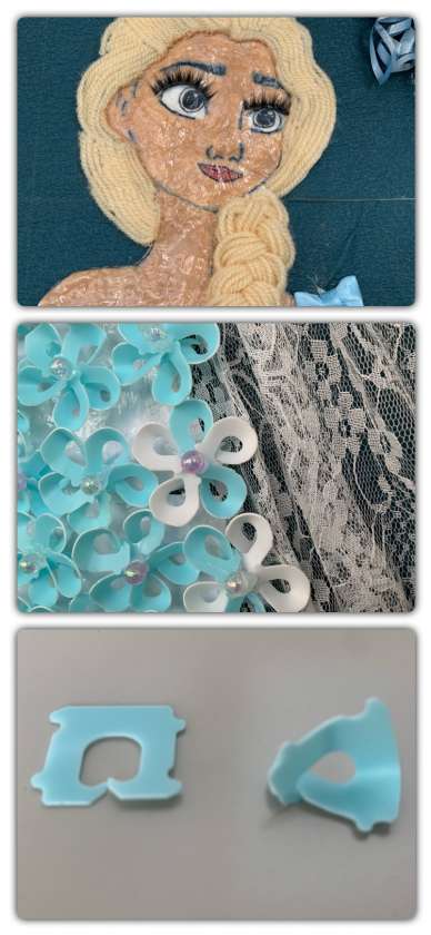 ところで、美しいドレスは何を材料にしているのでしょうか。実は、食パンなどの袋のとめ具をたくさん集めて、それを丸くして花びらにし、花びら5つで一つの花を作って、それを何百個もきれいな飾りのついたピンで留めていったそうです。気が遠くなるような作業ですが、細かな作業をこつこつと積み上げ、みんな一生懸命がんばりました。