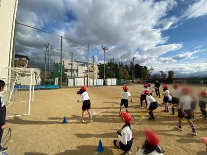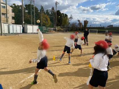 たいいくで、ソフトボール投げの練習をしました。