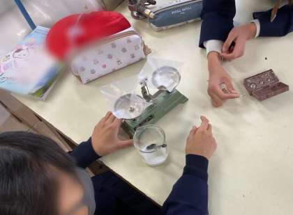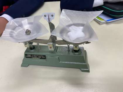 理科の学習で、物の溶け方の学習に入る前に、秤の使い方を学びました。電子秤を使うことが多いですが、上皿天秤の使い方を知り、薬品5gの重さを測って、用意しました。天秤を左右合わせるのが難しかったようです。