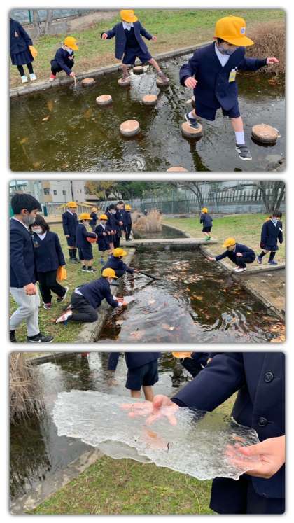 日本列島各地に冬将軍が到来し大雪に見舞われている地域も多い中、川辺小学校にもかわいい冬将軍が来て、朝から子どもたちが大はしゃぎしています。なんと川辺池は一面、氷に覆われていて、さっそくその氷をゲットしました。おっと、その池を渡る低学年チャレンジャーもいます。オタマジャクシを心配する児童もいました。