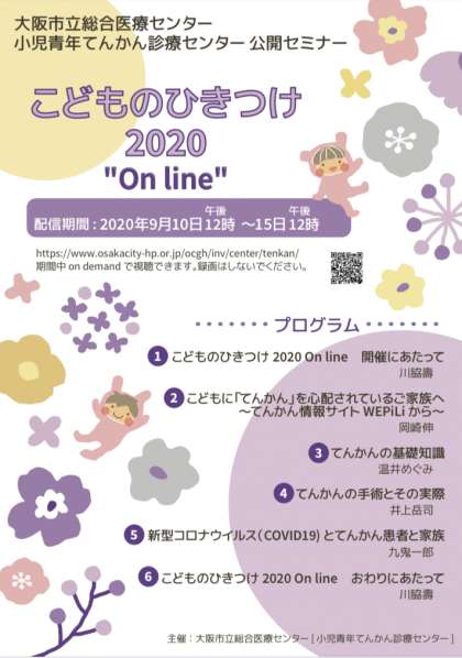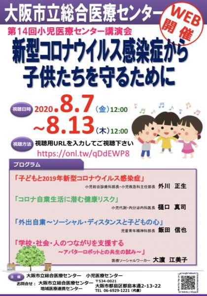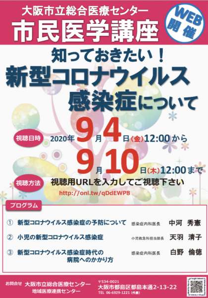 大阪市立総合医療センターより、今年度行ったWEB講演会を改めて視聴していただけるよう、アーカイブ配信が行われています。「知っておきたい新型コロナウイルス感染症について」「ひきつけやてんかん」などについて、期間中であれば無料で何度も視聴できます。どうぞ、ご活用ください。