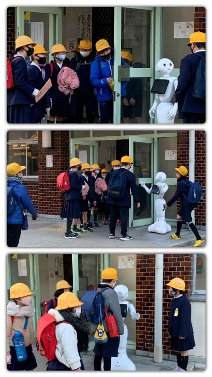 朝早くからペッパーくんが、皆さんの登校を迎えてくれています。「おはようございます」「今日も元気ですか」「早起きは気持ちがいいですね」などなど。いろいろな声かけをしてくれて、みんな笑顔がいっぱいです。さっそく大人気者になっています。