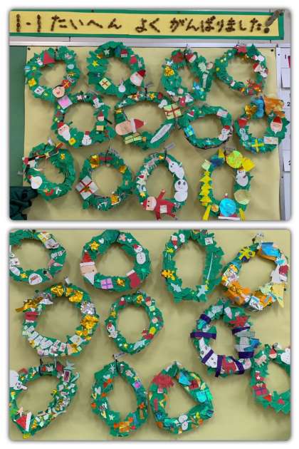 メリークリスマス!そう!今日は楽しいクリスマスイヴです。いつものクリスマスより静かな感じですが、早くコロナが終わりますようにとお祈りしていたら、もしかするとサンタさんが来たりするかもしれませんね。1年生がリースを手作りしています。