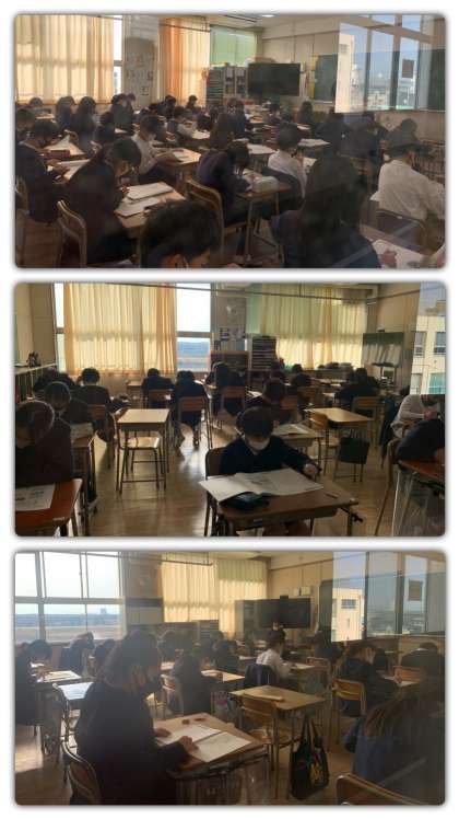 問題冊子と解答用紙が別々になっていて、普段とは違うテストでしたが、どのクラスも落ち着いて一生けん命に取り組んでいる姿が見られました。結果は、3月ぐらいに学校に届く予定です。