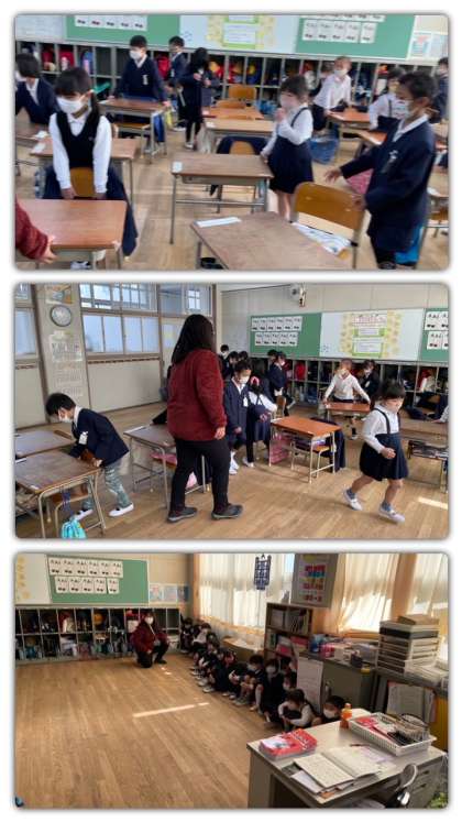 まず、みんなで行動による訓練をした後、担当の先生と校長先生からお話しをしました。
