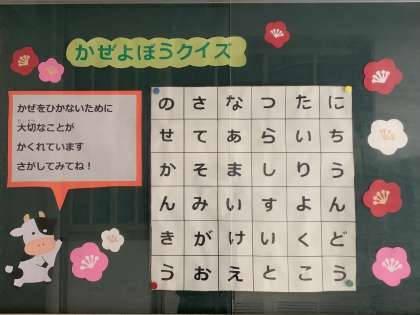 外出から帰ったら、まず石けんで手洗い・うがいをしましょう。常にマスクもしているので、今年は風邪やインフルエンザは流行していませんが、自分でできる予防対策はしっかりとやっておこう。また、冬は、お風呂から上がったときに湯冷めしたり、寝ている時にいつの間にかお布団から飛び出ていて寝冷えしたりすると、風邪をひきやすくなりますので注意しましょう。