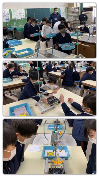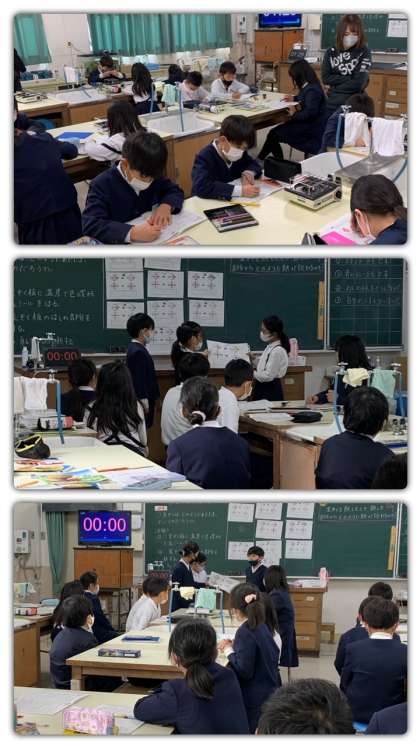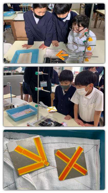 3限目、4年2組は東島先生の理科の授業でした。単元は「もののあたたまり方」で、本時は「金ぞくはどのようにあたたまっていくのだろうか」という学習を実験を通して行いました。示温テープの色が熱せられたところからどんどん変化するのがわかりました。みんなとても先生のお話や指示をよく聞いて、テキパキと手際よく活動していました。