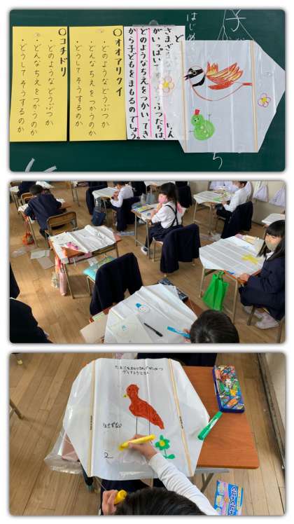 1年生では、いろいろな動物のお勉強をした後、自分が描きたい動物を自分で選んでポリ袋にその絵を描いて凧を作っています。