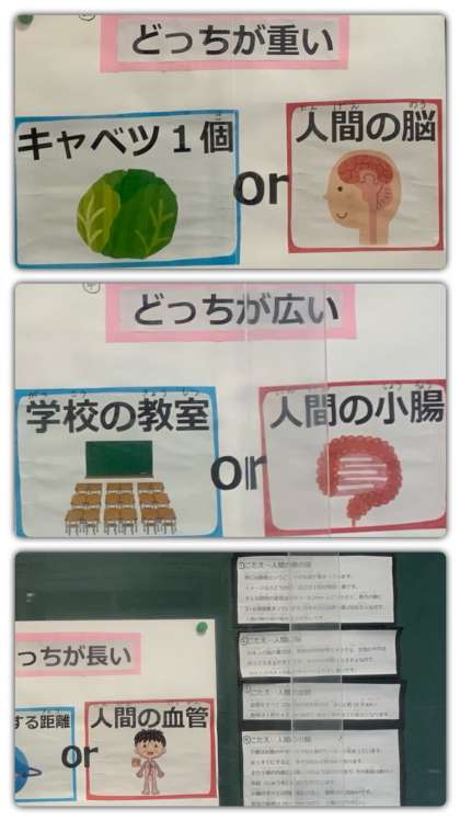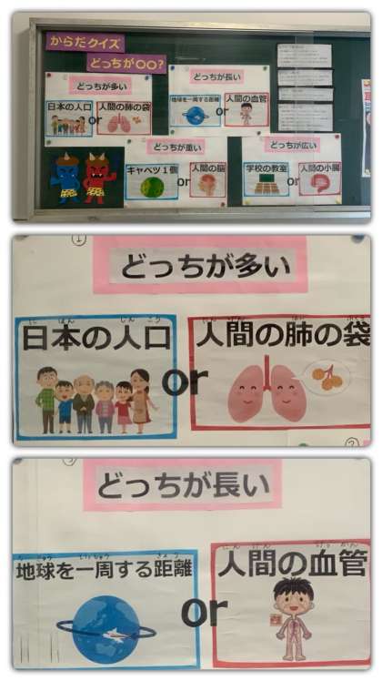 保健室前廊下の掲示板に「からだクイズ」の掲示物があります。一度考えてみましょう。人間のからだのすごさがわかるかも。