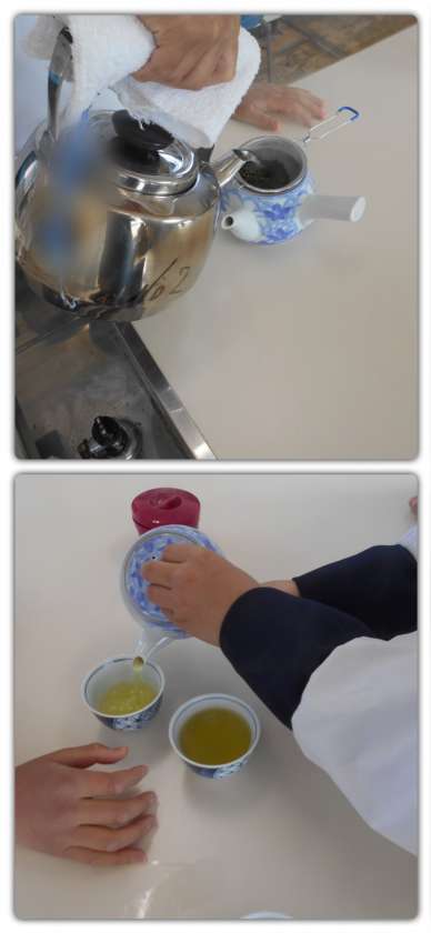 急須に茶葉とお湯を入れて、茶器には、お茶が同じ濃さになるよう、少しずつ注ぎ入れました。