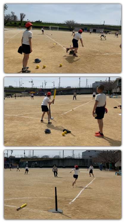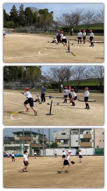 運動場では、6年2組が二つのチームに分かれて「Tボール」をしました。手軽に楽しくスポーツに親しむことができました。みんなと遊べるのもあと一日です。晴れていて気持ちの良いお天気でした。緑地帯の緑もだんだん春色になってきています。