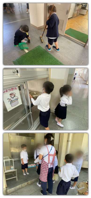 1年生は、学校生活に慣れてきて、丁寧に掃除をしています。給食の後の片付けも上手になってきました。