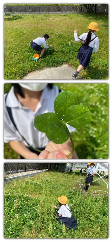 と、見ると、束になってたくさん生えていました。夢中になってクローバーを見つけている子や、バッタが出てき始めているので、バッタを探している子、池の中のおたまじゃくしを探している子と、自然と楽しんでいる子がたくさんいました。