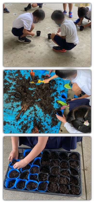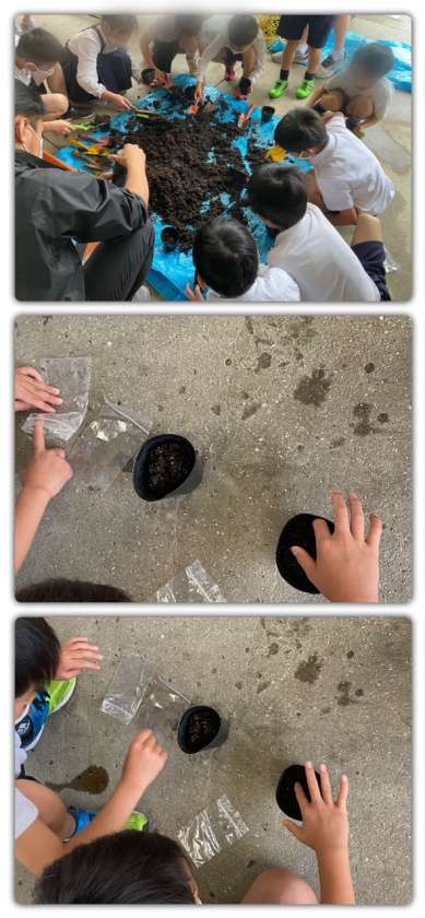 1人ずつ丁寧に、ビニルポットに土を入れて、小さなタネを植えていました。