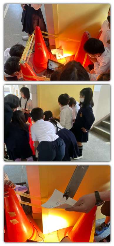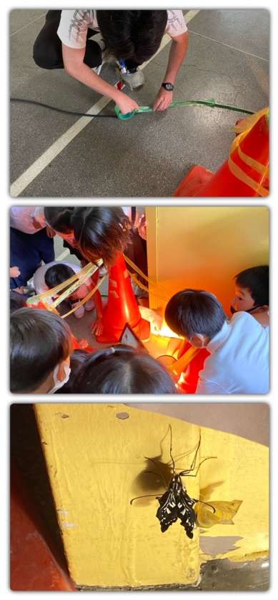 給食中の時間、理科のF先生が、サナギにライトを蛹に照らして40分後、ちょうど休み時間にサナギからチョウが出てきました。