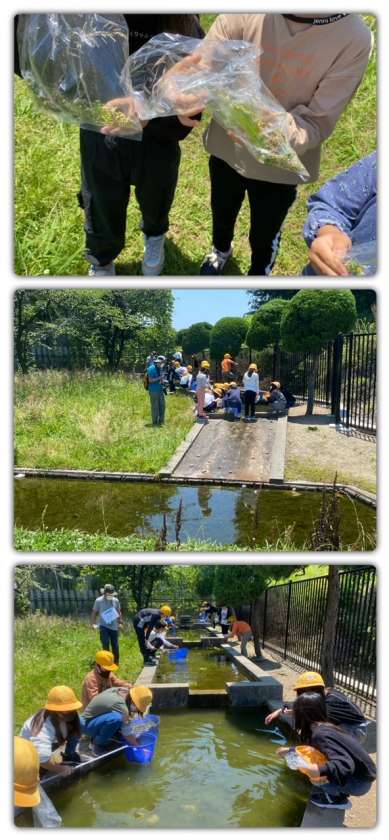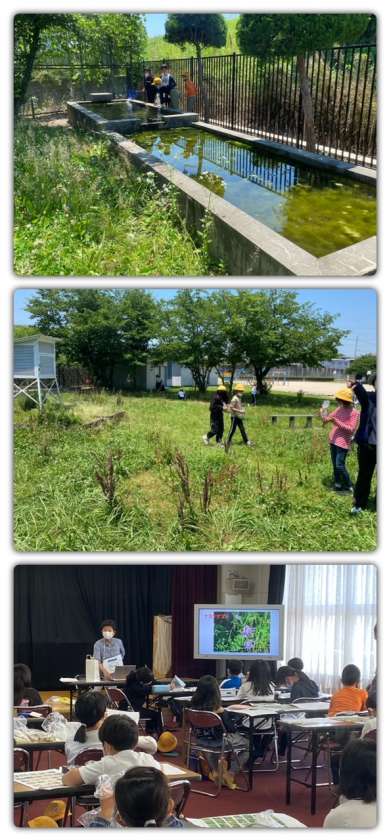 4年生は、大阪市の環境科学習の専門の研究者の方々にお越しいただき、「生き物探し出前講座」に参加しました。川辺池やその周りの雑草園で植物や昆虫、水中の生き物を探して、観察を行いました。