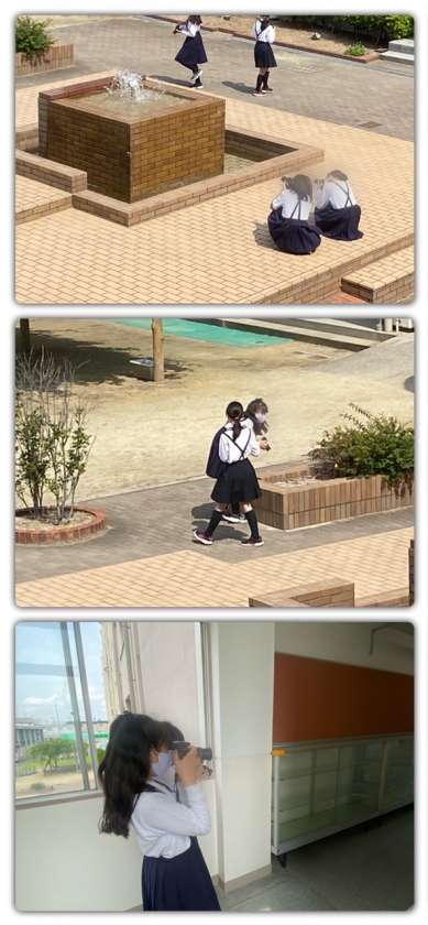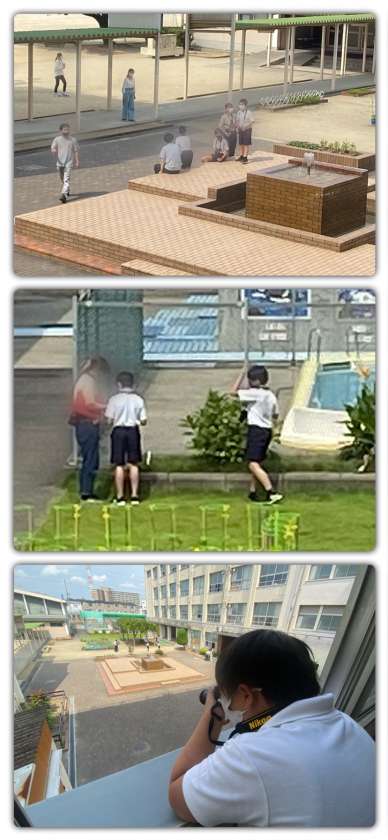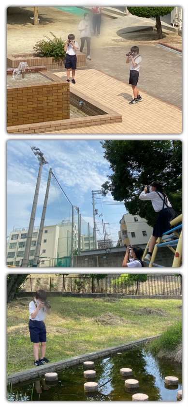 池や草花の近くの生き物や、学校から外にカメラを向けてハルカスを撮ったり、噴水の水の出るタイミングをはかって撮影したりしていました。