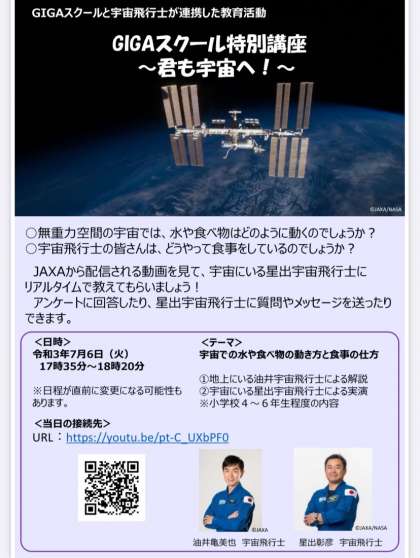 明日7/6、GIGAスクール特別講座〜君も宇宙へ!〜 開催されます!